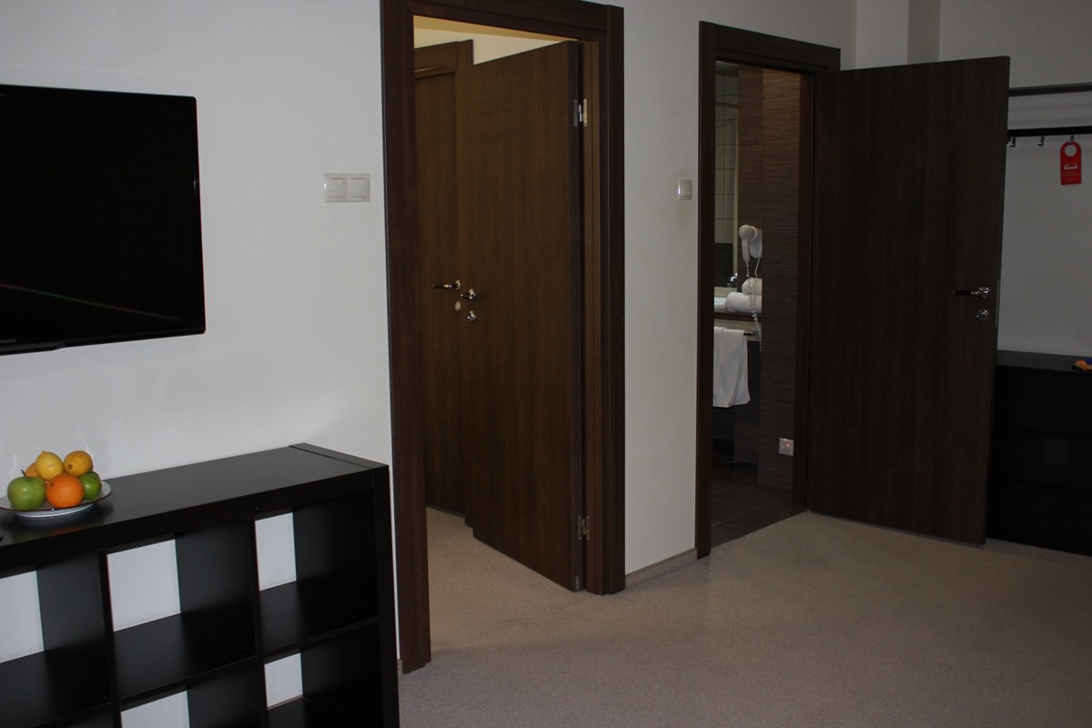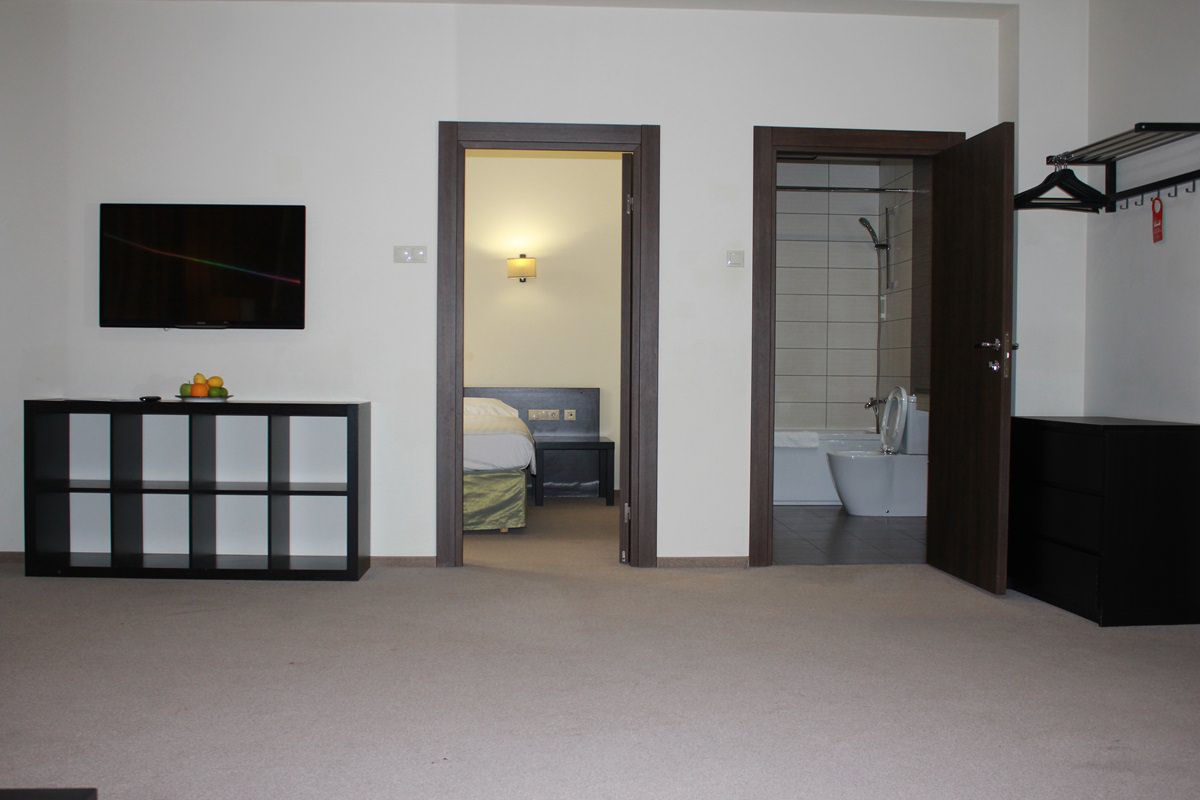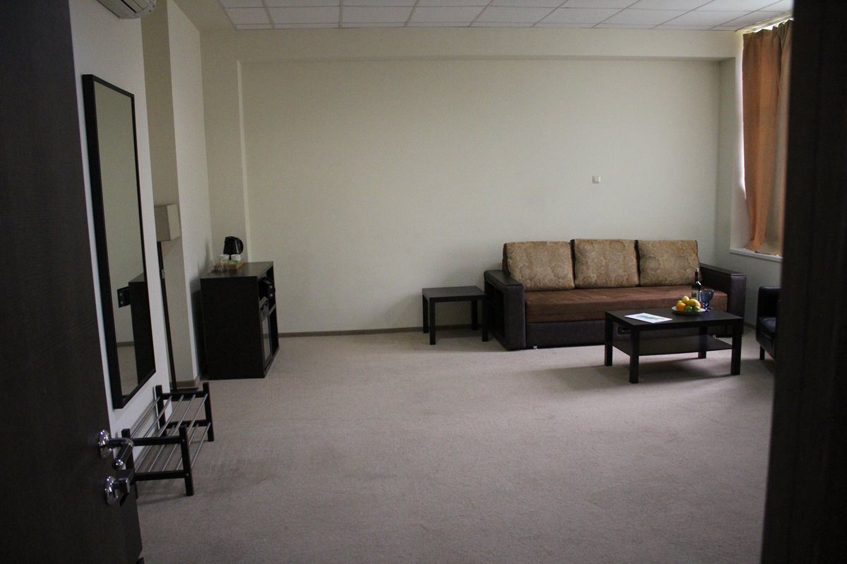 Площадь номера - 48 кв.м. 2 осн. места. 2 доп. места. Мебель: вешалка, диван раскладной, зеркало, кровать двуспальная, прикроватные тумбочки, стол, столик журнальный, стул, шкаф. Оборудование: кондиционер, набор посуды, сейф, телевизор, холодильник, электрочайник. Санузел. Сервис: смена полотенец, смена постельного белья, уборка номера.